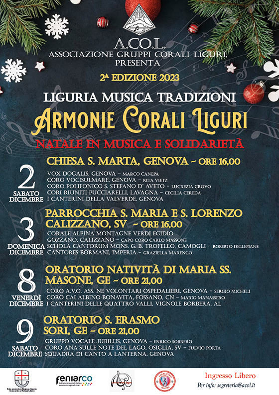 Al via la seconda edizione della rassegna natalizia "Liguria Musica Tradizioni - Armonie Corali Liguri", a cura di A.CO.L. Associazione Gruppi Corali Liguri nata nel 1989 dal fondatore Cav. Mauro Ottobrini sempre ricordato con affetto.Rimandiamo al link di Prima Illevante per ulteriori informazioni.